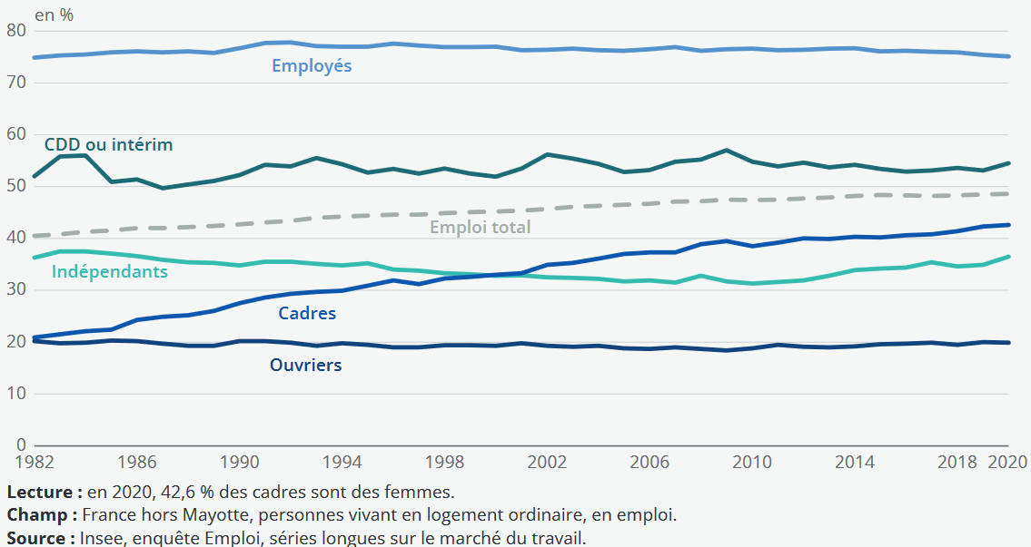 Les emplois occupés par les femmes sont encore très différents de ceux des hommes par le statut, la profession ou le secteur d’activité. Les femmes en emploi sont plus souvent salariées avec un emploi de fonctionnaire. 22,5 % d’entre elles sont fonctionnaires (contre 12,2 % pour leurs homologues masculins) tandis que 54,9 % d’entre elles sont en CDI (contre 61 % des hommes en emploi). Elles sont plus souvent en contrat à durée déterminée que les hommes mais moins en intérim ou en contrat d’apprentissage. En 2020, plus d’une personne sur deux qui occupe un emploi à durée limitée est une femme. Enfin, les femmes ont moins le statut d’indépendant même si l’augmentation de la part des femmes au sein des indépendants est régulière depuis 10 ans car les professions indépendantes dont le poids augmente le plus sont aussi les plus féminisées (professions libérales de santé notamment).