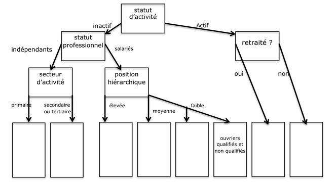 2) Complétez le schéma suivant avec les PCS manquantes (autres inactifs ; agriculteurs exploitants ; cadres et professions intellectuelles supérieures ; artisans, commerçants et chefs d’entreprises ; retraités ; employés qualifiés et non qualifiés ; professions intermédiaires):
