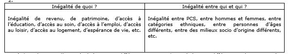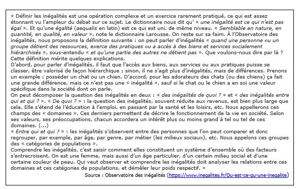 En Terminale, tu aborderas les multiples facteurs de structuration et de hiérarchisation de l’espace sociale. Cela sera l’occasion d’analyser les inégalités issues de l’appartenance aux différentes PCS, mais aussi associées à d’autres facteurs comme le genre, le lieu de résidence etc. Commençons par préciser ce que signifie « inégalité »...