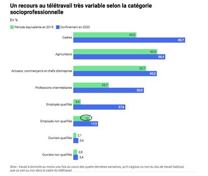 4. Faites une phrase de lecture pour comparer le recours au télétravail chez les cadres et les ouvriers non qualifiés au cours du confinement 2020.