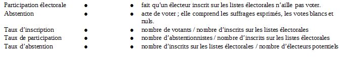 Participation électorale = acte de voter ; elle comprend les suffrages exprimés, les votes blancs et nuls.