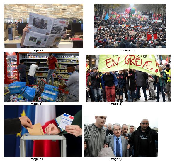 1. a) le suivi de l’actualité politique dans les médias ; b) la participation à une manifestation ; c) le boycott ; d) la participation à une grève ; e) le vote ; f) la séquestration d’un patron