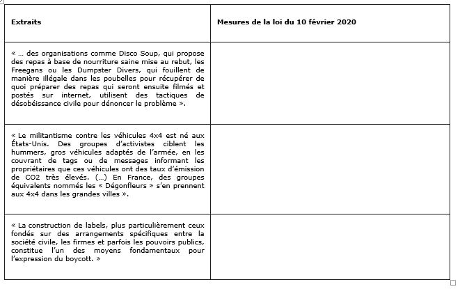 Établissez des liens entre les formes de consommation engagée extraites de l’ouvrage La consommation engagée de Sophie Dubuisson-Quellier (à gauche) et les mesures de cette loi (à droite) :