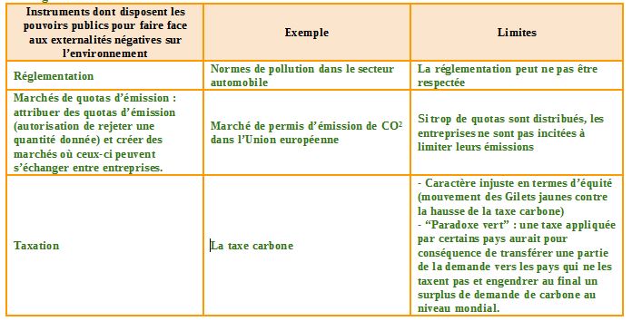 [...] La question que se posent alors les économistes est la suivante : comment modifier le système de prix de façon qu’il reflète mieux le coût de l’utilisation intensive du carbone de nos sociétés afin d’en réduire la production ? Ainsi, les politiques d’ « atténuation » ont pour vocation d’agir ex ante de l’émission de GES contrairement aux politiques d’ « adaptation » qui agissent ex post. Une bonne politique doit être guidée par un triple objectif : efficacité (limiter les émissions de GES sous un certain niveau), efficiente (limiter les coûts compte tenu de l’objectif) et équitable (considérée comme juste compte tenu de critères définis et partagés). Ces critères permettent d’arbitrer entre 3 solutions : la réglementation (l’Etat édicte des normes, des interdictions), la taxation des émissions de carbone, et la création d’un marché de droits.