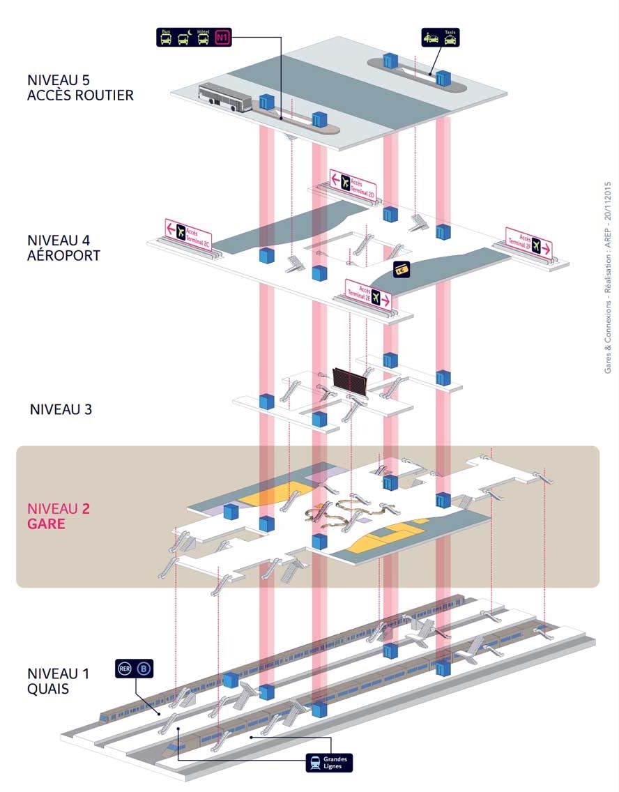 Listez les différents modes de transports réunis à l’aéroport Charles de Gaulle et les échelles associées.