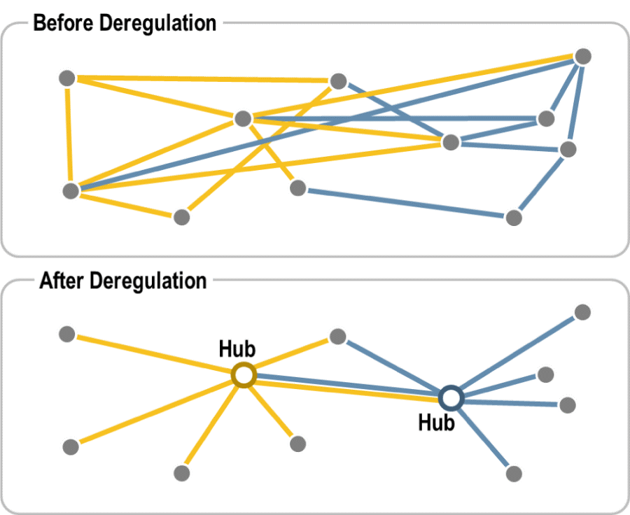 Depuis la mise en concurrence des compagnies et lignes aériennes dans un contexte de dérégulation du système de transport aérien à partir des années 1980, les compagnies aériennes se concentrent sur un hub principal (Roissy pour Air France par exemple), renforçant leur domination sur les dessertes des villes secondaires.