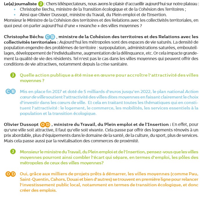 Exercice de simulation d’une interview du Ministre du Travail, du Plein emploi et de l’Insertion et du ministre de la Transition écologique et de la Cohésion des territoires, tous deux invités au journal télévisé de 20 heures.