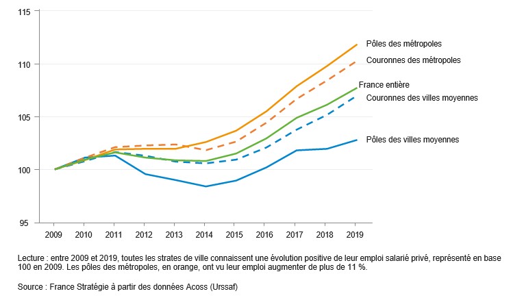 L’effet de la pandémie s’est avéré d’ampleur variée selon les territoires, et il est difficile aujourd’hui de conclure à un effet positif général en faveur des villes moyennes étudiées. . Les auteurs de la note de France Stratégie soulignent néanmoins que la dynamique en matière d’emploi est en moyenne supérieure dans les villes moyennes à celle des métropoles depuis 2020, puisque 77 villes moyennes ont créé plus de 3 % d’emploi, soit près de 1 point de plus que la moyenne nationale, contrairement à la décennie précédant la crise sanitaire (. Toutefois, ce constat ne doit pas être généralisé car si les villes moyennes dynamiques pendant la dernière décennie ont été moins affectées par la crise sanitaire, 42 villes ont détruit des emplois entre 2019 et 2021 (Amné- ville-Rombas, Chaumont ou Sarreguemines, par exemple).