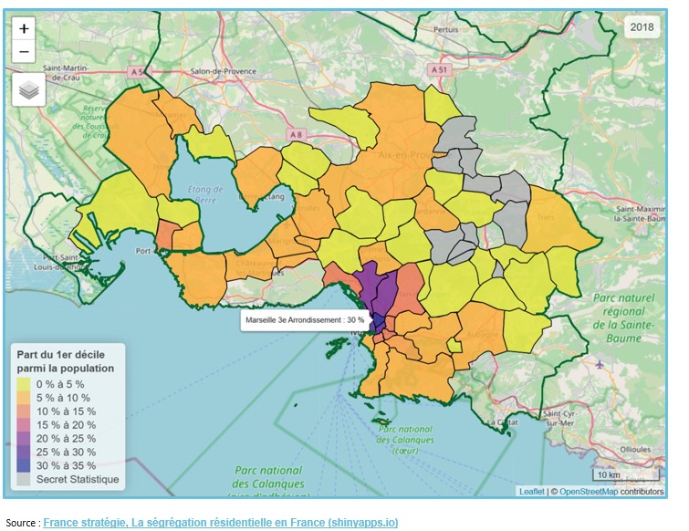 D’après les données mobilisées par France Stratégie et en provenance de l’Insee, en 2018, 3O % des habitants du 3e arrondissement de Marseille appartiennent au premier décile de niveau de vie. Dans les arrondissements du sud de la ville en revanche, les habitants appartenant au premier décile ne représentent qu’environ 15 % de la population, soit une part deux fois plus faible. Le 3e arrondissement concentre donc dans sa population de résidents une plus grande pauvreté que dans les arrondissements du sud.