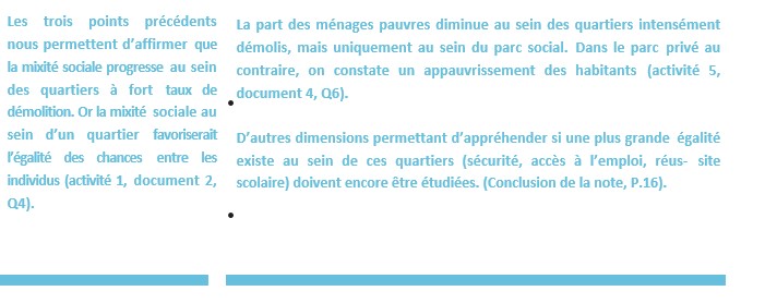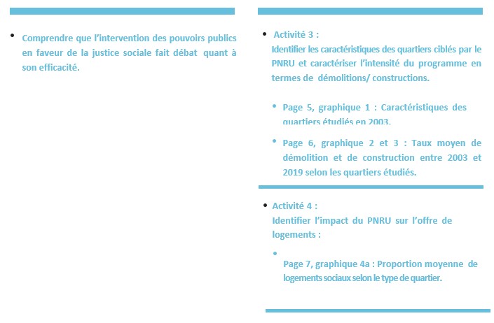 Les activités proposées ci-dessous à partir de la note d’analyse « Quinze ans de PNRU : quels effets sur l’habitat et le peuplement ? » ont pour objectif d’étendre ou d’approfondir certaines connaissances et de travailler des savoir-faire. À partir de la lecture et de l’analyse de documents d’experts, il s’agit de travailler de courts exercices qui éveilleront la curiosité des élèves sur des points d’actualité et inviteront à s’interroger sur les résultats des politiques publiques. Les activités ci-dessous n’ont pas l’ambition d’utiliser chaque élément de la note d’analyse de France Stratégie; elles constituent un guide pour s’approprier les principaux enjeux qu’elle met en exergue.