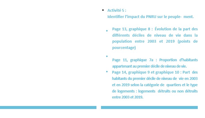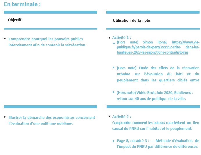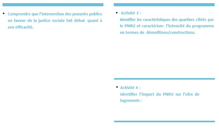 Les activités proposées à partir de la note d’analyse de France Stratégie "Quinze ans de PNRU : quels effets sur l’habitat et le peuplement ?" ont pour objectif d’étendre ou d’approfondir certaines connaissances et de travailler des savoir-faire. À partir de la lecture et de l’analyse de documents d’experts, il s’agit de travailler de courts exercices qui éveilleront la curiosité des élèves sur des points d’actualité et inviteront à s’interroger sur les résultats des politiques publiques. Les activités ci-dessous n’ont pas l’ambition d’utiliser chaque élément de la note d’analyse de France Stratégie ; elles constituent un guide pour s’approprier les principaux enjeux qu’elle met en exergue.