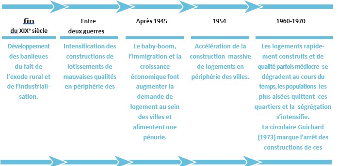 Q2. À l’aide du document 1, renseignez la frise chronologique proposée, en faisant apparaître comment les banlieues sont devenues des quartiers pauvres et ségrégués.