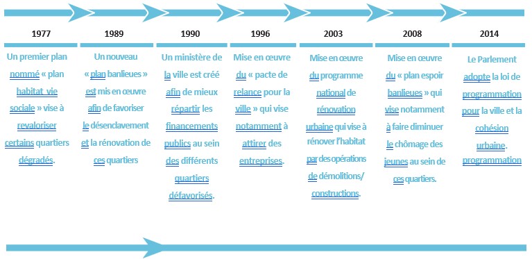 Q1. A l’aide du document 3, relevez les différentes mesures prises par les pouvoirs publics en faveur de la lutte contre la ségrégation spatiale au sein des quartiers les plus défavorisés de France. Vous pourrez formuler votre réponse en réalisant une frise chronologique