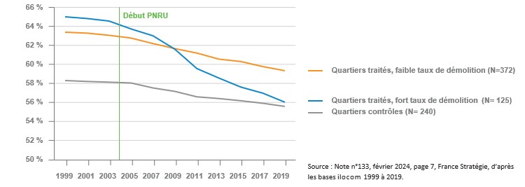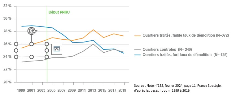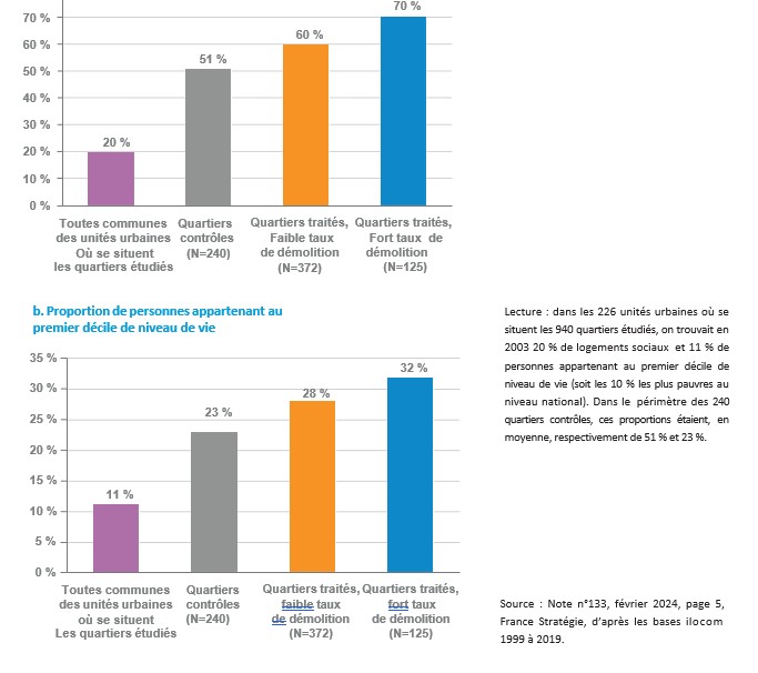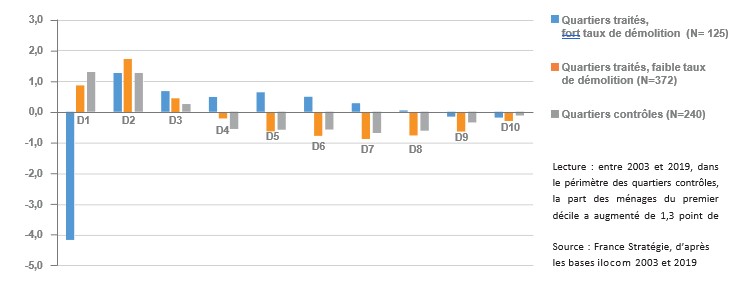 Au sein des quartiers visés par le PNRU, la part des habitants du premier décile était extrêmement élevée : plus de 28 % en 2003 contre 11 % en moyenne dans les unités urbaines de ces quartiers. Il ressort de cette étude que le PNRU a causé une baisse importante de la part des habitants les plus pauvres au sein des quartiers traités intensément démolis. Cette diminution de la part des ménages pauvres au sein des quartiers rénovés fortement démolis s’explique principalement par les démolitions car ces dernières visaient en priorité les quartiers les plus dégradés et ayant une forte concentration de ménages ayant un faible niveau de vie. Elle s’explique également par le fait que les logements sociaux nouvellement construits attirent davantage de ménages légèrement plus aisés que les logements sociaux anciens. Au sein des quartiers traités faiblement démolis en revanche, l’étude montre que le PNRU n’a pas eu d’impact significatif sur le peuplement et n’a pas permis d’enrayer la paupérisation.