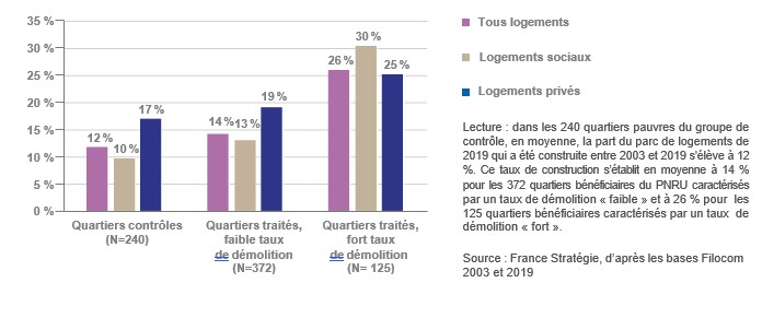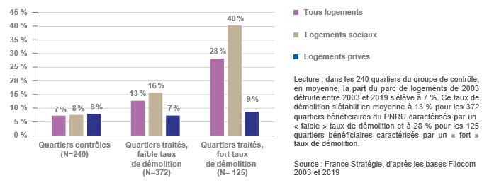 Afin de rendre compte de l’impact du PNRU sur la part de logement sociaux au sein des quartiers traités, deux catégories sont distinguées : les quartiers traités ayant subi un fort taux de démolition et les quartiers traités avec un faible taux de démolition.