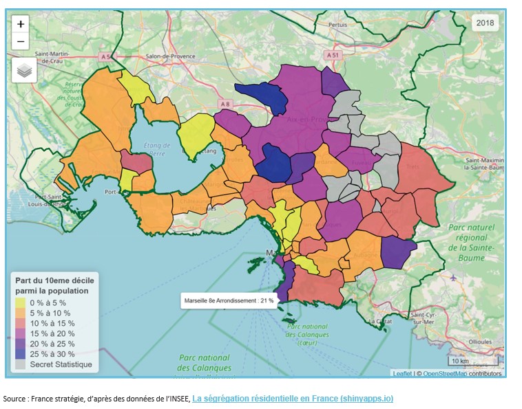 En 2018, 21 % des habitants du 8e arrondissement de Marseille appartiennent au dixième décile de niveau de vie. Dans le 3e arrondissements en revanche, les habitants appartenant au dixième décile ne représentent que de 0 % à 5 % seulement de la population. Le 8e arrondissement concentre donc une part de populations aisées jusqu’à quatre fois plus importante que le 3e arrondissement.