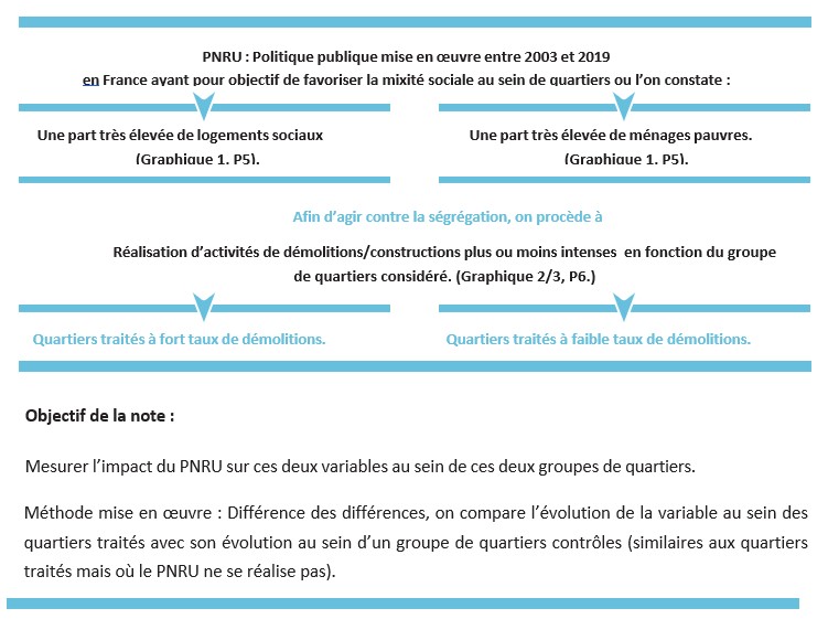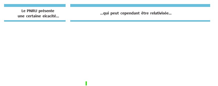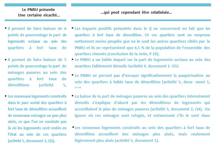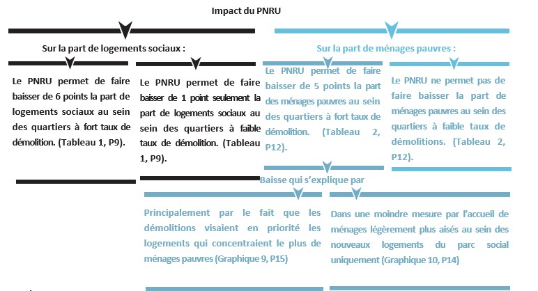 Il ressort de cette étude le PNRU a eu un impact sur l’offre de logements et sur le peuplement des quartiers ciblés les plus intensément démolis : il a contribué à faire diminuer la part de logements sociaux ainsi que la part des ménages les plus pauvres. En revanche, dans les autres quartiers ciblés, où les interventions ont été moins intenses, l’impact du PNRU est quasi nul. Afin de poursuivre la réflexion sur l’évaluation de cette politiquepublique, il serait intéressant d’étudierl’impact du PNRU sur d’autres problématiques économiques et sociales : Le PNRU a-t-il contribué à renforcer la sécurité au sein de ces quartiers ? A-t-il favorisé l’accès à l’emploi et réduit les inégalités de réussite scolaire ? Par ailleurs, alors que le coût environnemental de ces opérations lourdes est important, il semble néces- saire de questionner le bilan environnemental de ce programme permettra-t-il des gains de long terme en matière de consommation énergétique ?