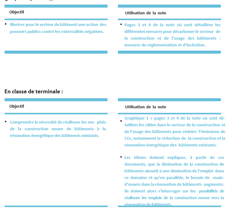 Les activités proposées ci-dessous à partir de la note d’analyse « Rénovation énergétique des bâtiments : quels besoins de main-d’œuvre en 2030 ? » ont pour objectif d’étendre ou d’approfondir certaines connaissances et de travailler des savoir-faire. À partir de la lecture et de l’analyse de documents d’experts, il s’agit de travailler de courts exercices qui éveilleront la curiosité des élèves sur des points d’actualité et inviteront à s’interroger sur les résultats des politiques publiques. Les activités ci-dessous n’ont pas l’ambition d’utiliser chaque élément de la note d’analyse de France Stratégie ; elles constituent un guide pour s’approprier les principaux enjeux qu’elle met en exergue.