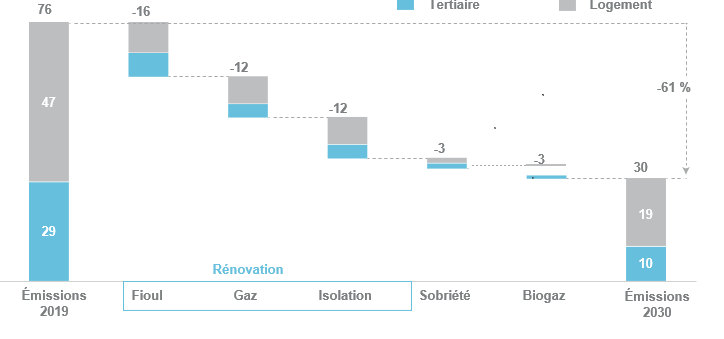 L’enjeu climatique oblige à un effort important de décarbonation du secteur des bâtiments, qui porte en majorité sur le parc existant. Des objectifs chiffrés ont été définis,qui passent par trois grands leviers :