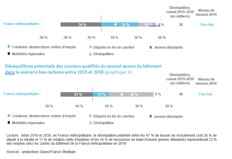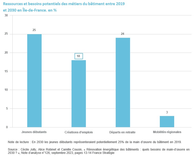 Mais les besoins de main-d’œuvre concernent aussi le remplacement des salariés en fin de carrière, en particulier parmi les ouvriers qualifiés du bâtiment.Il pourrait en résulter un déséquilibre, les nouveaux entrants sur le marché du travail devant être moins nombreux que les départs à la retraite. Ceci est de nature à accentuer la pénurie en emploi que pourrait connaître le secteur du bâtiment et en particulier la rénovation énergétique d’ici 2030, étant donné l’augmentation des besoins en emploi que nécessite la réduction des émissions carbone.