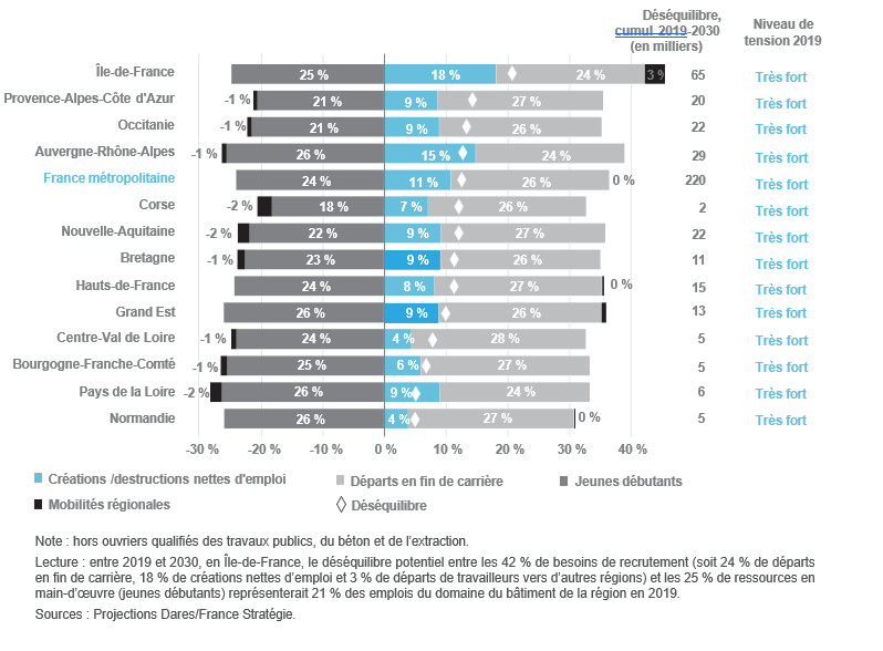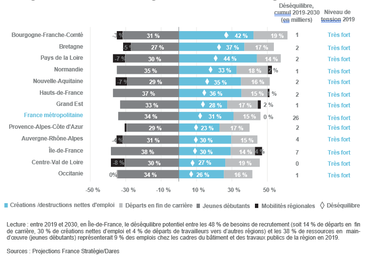 les cadres du bâtiment (architectes, ingénieurs, chefs de chantier, etc.) : ils ont une pyramide des âges plus jeune que la moyenne et exercent des métiers attractifs auprès des jeunes.Toutefois, les créations d’emploi seraient particulièrement importantes et dépasseraient largement le nombre de jeunes débutants entrants sur le marché du travail dans ce secteur d’ici 2030. Cette situation nécessitera de recourir à des techniciens, moins qualifiés, en encourageant leur mobilité ascendante.