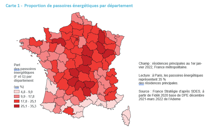 L’état du bâti : le chauffage étant le principal facteur d’émission de gaz à effet de serre des bâtiments, les besoins de rénovation sont plus importants dans les régions les plus froides (Auvergne-Rhône-Alpes, Nord-Est, Île-de-France). C’est ce qui explique que les passoires énergétiques sont proportionnellement moins nombreuses dans les régions où le climat est le plus doux (côtes méditerranéenne et atlantique, Corse).