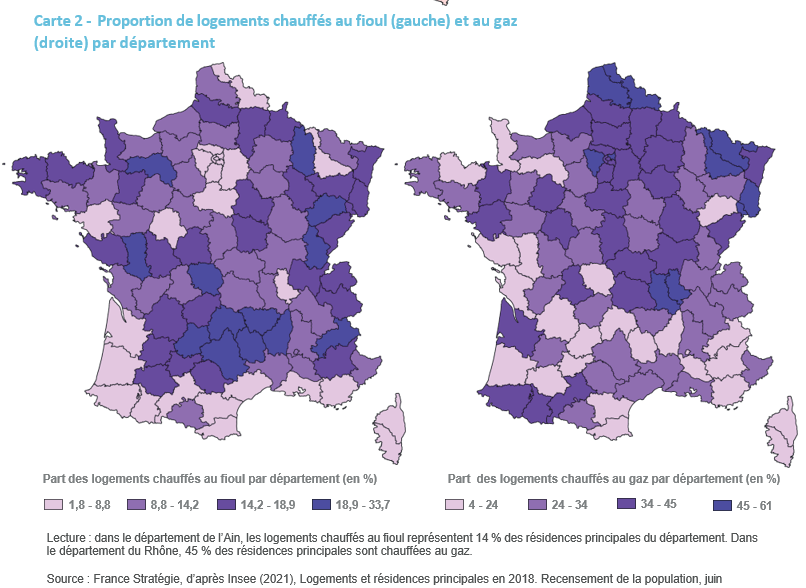 Le mode de chauffage : les chaudières au fioul, les plus polluantes, qu’il s’agit de remplacer en priorité, sont proportionnellement plus présentes dans les zones rurales. L’objectif gouverne- mental est de remplacer 75 % de ces chaudières d’ici à 2030. De plus, les chaudières à gaz sont plus présentes en région parisienne et dans le quart nord-est du pays. L’objectif est de remplacer 20 % de ces chaudières d’ici 2030.
