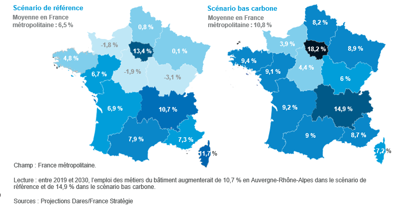 D’après les projections réalisées par la Dares et France Stratégie, les créations d’emplois d’ici 2030, induites par la poursuite des objectifs nationaux de réduction des émissions de gaz à effet de serre, seront inégales sur l’ensemble du territoire. Pour évaluer les besoins de main-d’œuvre au niveau local, il faut tenir compte de deux facteurs exposés ci-après.