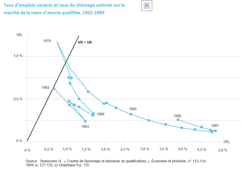 La courbe de Beveridge offre une représentation graphique de la relation négative entre le taux de chômage et le taux d’emplois vacants. L’économie connaît un flux permanent de création et de destruction d’emplois. […] Mais le processus d’appariement des travailleurs et des emplois n’est pas instantané. La position sur la courbe est un indicateur de la situation conjoncturelle de l’économie : lorsque la conjoncture est bonne, le chômage est faible et le taux d’emplois vacants est élevé ; inversement lors d’une conjoncture défavorable. La courbe renseigne aussi le fonctionnement du marché du travail. Ainsi, un éloignement de la courbe de l’origine indique une dégradation de l’adéquation entre l’offre et la demande de travail : pour un même taux d’emplois vacants, il y a u taux de chômage élevé.