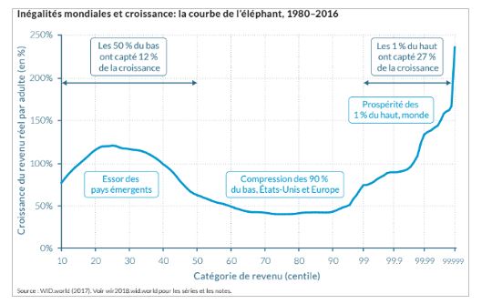 Pour rendre compte de l’évolution des inégalités de revenu entre les habitants de la planète entre 1980 et 2016, les auteurs du rapport utilise la courbe de l’éléphant – nommée ainsi en raison de sa forme caractéristique – imaginée par Branko Milanovic pour la Banque mondiale (Branko Milanovic, Global inequality : A New Approach for the Age of Globalization, 2016). Cette représentation permet de prendre la mesure des grandes évolutions d’inégalités de revenu dans le monde avec un seul graphique (voir document ci-dessous).