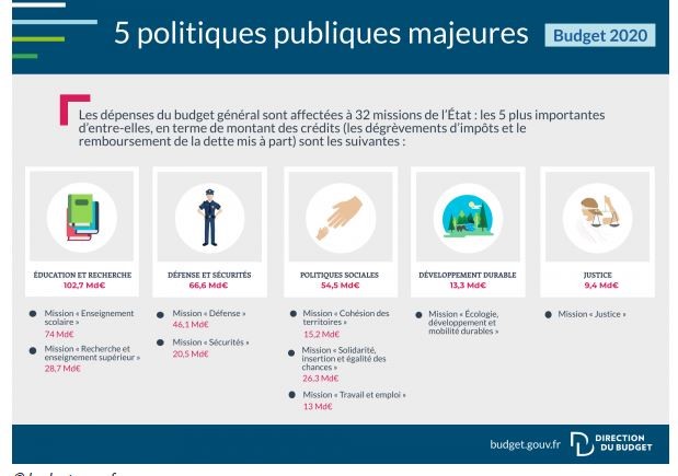 La même année, les dépenses de l’Etat s’établissent à 343,7 milliards d’euros. Le total des crédits alloués aux 32 missions s’élève à 478,5 milliards d’euros, mais il faut déduire 140,8 milliards d’euros de la mission technique « Remboursement et dégrèvements » pour obtenir 343,7 milliards. Comme on vient de le voir, les recettes nettes s’élevant à 250,7 milliards d’euros, le solde du budget général tel qu’il a été voté s’établissait à 93,06 milliards d’euros, soit un déficit budgétaire prévu de 93,06/2479,4, soit 3,8% (le déficit budgétaire est mesuré en pourcentage du Produit intérieur brut : 2479,4 milliards en 2020). Les dépenses principales de ce budget sont consacrées à l’Education et à la Recherche (102,7 milliards), la Défense et la Sécurité (66,6 milliards), les politiques sociales (54,5 milliards), le Développent durable (13,3 milliards) et la Justice (9,4 milliards).