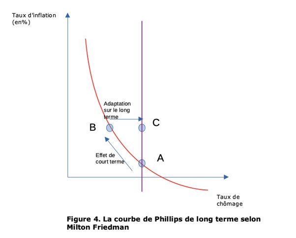 Pour lui, la courbe de Phillips « keynésienne » repose sur le principe de « l’illusion monétaire » ou « illusion nominale » : selon Keynes, en effet, les salariés raisonnent en termes de salaires nominaux. L’augmentation des salaires nominaux (et de manière générale de toutes les encaisses nominales, ce qui vient après une création monétaire importante) crée, certes de l’inflation, mais elle relance l’activité en stimulant la consommation et donc la demande effective. Par ailleurs, l’inflation permet une baisse ou au moins un maintien du niveau des salaires réels. Or, les employeurs raisonnent selon ces salaires réels : une inflation plus rapide que la croissance des salaires nominaux diminue les salaires réels et stimule l’embauche. Or, selon Friedman, cette illusion monétaire n’est vraie qu’à court terme. À long terme, les agents adaptent leurs anticipations et, d’une certaine manière, corrigent leurs erreurs. Dans ce cas, l’inflation ne réduit plus le chômage et la politique conjoncturelle ne peut agir que sur les prix. L’analyse de la courbe de Phillips est vraie à court terme (déplacement du point A au point B sur le graphique 4) mais la correction de l’illusion monétaire conduit au déplacement du point B au point C : on retrouve le taux de chômage du départ avec un taux d’inflation plus élevé. A long terme, la courbe de Phillips est une droite verticale (droite violette sur la figure 4), qui montre qu’il existe un niveau de chômage indépassable sur le long terme, qui peut être qualifié de chômage structurel ou de chômage naturel (NAIRU). Dès lors, plutôt que de mener des politiques conjoncturelles, les pouvoirs publics doivent viser des réformes structurelles, seules capables de réduire ce NAIRU.