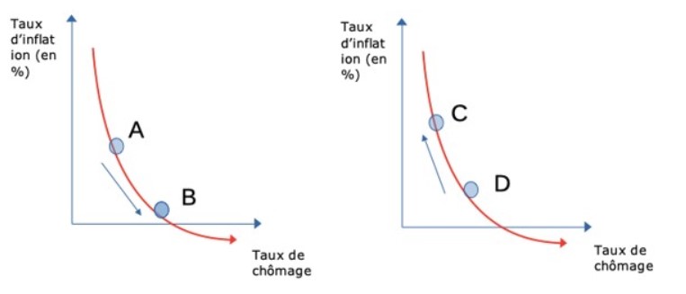 Cette courbe est devenu un outil puissant pour les politiques économiques puisqu’elle conduit à identifier une sorte de « dilemme » entre l’inflation et le chômage, qui sont deux objectifs apparemment contradictoires des politiques conjoncturelles. Une politique de relance, ou de soutien de l’activité permet de réduire le chômage, mais risque de conduire à une accélération de l’inflation (déplacement de A vers B sur la figure 3a) alors qu’une politique de lutte contre l’inflation (politique monétaire de rigueur par exemple) conduit à une hausse du chômage (déplacement de C vers D sur la figure 3b). Samuelson et Solow invitent alors à lire la courbe de Phillips comme le fait qu’il y a un prix à payer en termes de chômage pour maintenir une faible inflation et, inversement, qu’un faible taux de chômage se paie en termes d’inflation. Le choix entre ces deux objectifs est alors un choix politique. La courbe de Phillips est alors devenue l’un des instruments importants pour guider les politiques conjoncturelles lors des 30 Glorieuses, avec le modèle IS-LM.