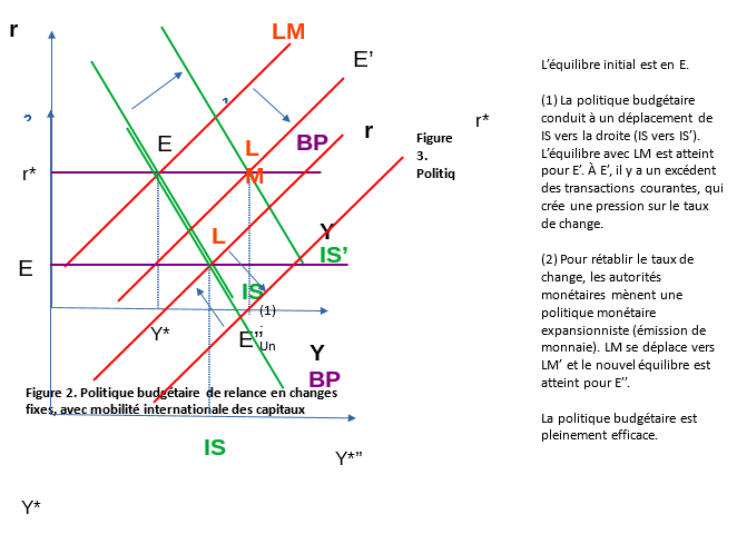 Ainsi, si les changes sont fixes, la politique monétaire est efficace, elle peut être menée et modifier le revenu d’équilibre (figure 2). Au contraire, la politique monétaire est impossible : elle est « réservée » à la défense du taux de change (figure 3).
