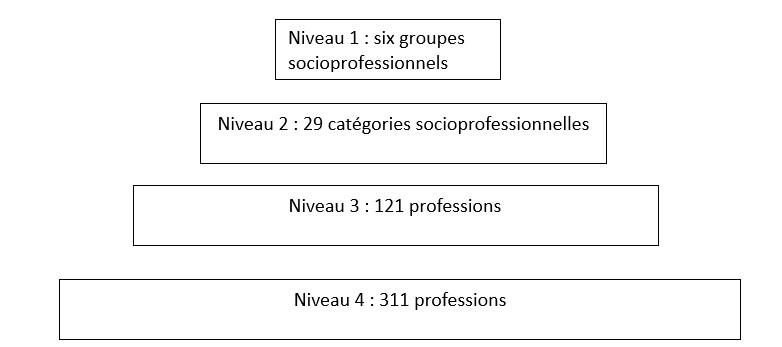 Dans le tableau ci-dessous, on peut voir la logique d’emboitement entre les groupes socioprofessionnels (niveau 1) et les catégories socioprofessionnelles (niveau 2)