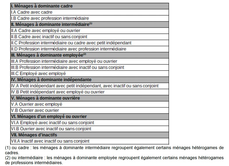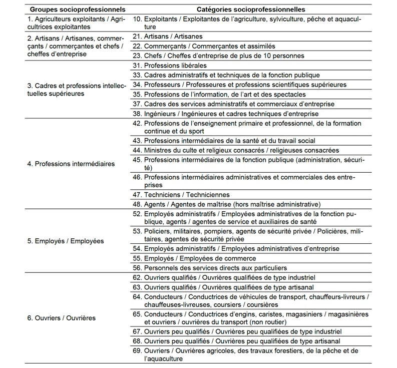 Il faut retenir le niveau 1, soit les six groupes socioprofessionnels d’actifs (dans l’ordre) :