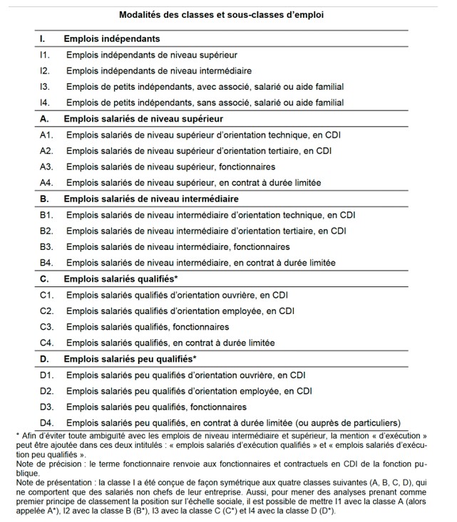 En conséquence, le schéma de « classes d’emploi » ne s’emboîte pas avec la nomenclature PCS, ne serait‐ce que parce qu’il redécoupe certaines professions pour tenir compte, en leur sein, de la situation différente des salariés et des indépendants (par exemple dans les domaines de la santé, du droit, des arts, etc.)
