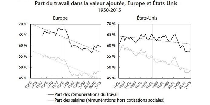 Depuis maintenant près de 40 ans (depuis le début des années 1980), dans l’ensemble des pays du monde, la part de la valeur ajoutée distribuée aux salariés n’a pas cessé de décroître. Sur cette période, elle est passée respectivement de 68% à 60% dans les pays européens, et de 65% à 58% aux Etats-Unis.