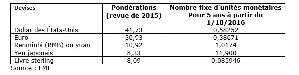 Le 1er octobre 2016, les pondérations dans le DTS était de 41,73 % pour le dollar des États-Unis et de 10,92 % pour le renminbi (RMB).