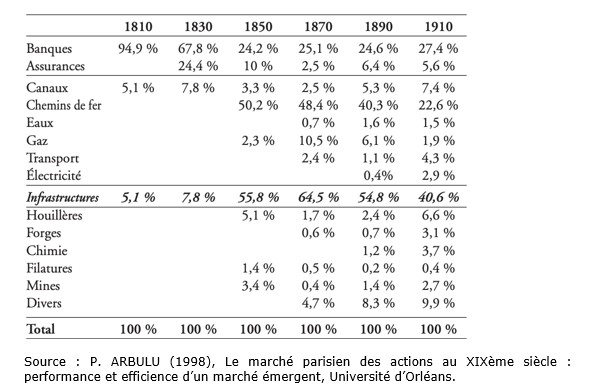 Premièrement, les secteurs qui font appel à l’épargne public pour se développer apparaissent très divers (banques, transports maritimes, filatures, mines, etc.). Toutefois, les sociétés spécialisées dans les infrastructures (canaux, chemin de fer, transport) dominent le marché boursier à partir du milieu des années 1830. Cette place s’explique surtout par l’importance des actions des compagnies de chemins de fer qui vont représenter la moitié de la capitalisation boursière de Paris au milieu du XIXème siècle (48,4% en 1870).