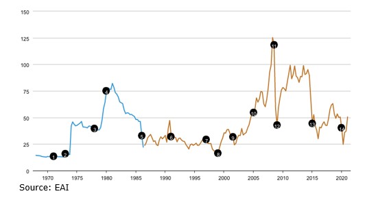 Document 12 - Coût d'acquisition du pétrole brut importé par le raffineur (1970-1986) puis prix du pétrole brut WTI (1986-2020)