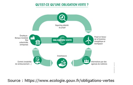 Selon le Ministère de la transition écologique, une obligation verte est un emprunt émis sur le marché par une entreprise ou une entité publique auprès d’investisseurs pour lui permettre de financer ses projets contribuant à la transition écologique (énergies renouvelables, efficacité énergétique, gestion durable des déchets et de l’eau, exploitation durable des terres, transport propre et adaptation aux changements climatiques...), plus particulièrement les investissements en infrastructures.