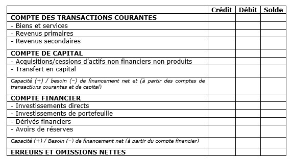 Du fait de l’enregistrement en partie double de chaque transaction, la différence les montants portés au crédit et les montants inscrits au débit est égale à zéro dans une balance des paiements nationale. En théorie, les comptes sont en équilibre.