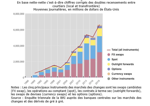 Selon l’Enquête triennale de la Banque des règlements internationaux (BRI) auprès des banques centrales sur les marchés des changes et des dérivés de gré à gré, les volumes quotidiens des transactions sur les devises s’élevaient en moyenne à 6600 milliards de dollars des États-Unis en avril 2019.