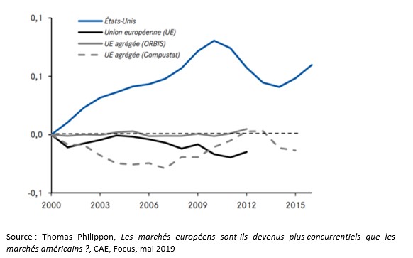Source : Thomas Philippon, Les marchés européens sont‐ils devenus plus concurrentiels que les marchés américains ?, CAE, Focus, mai 2019