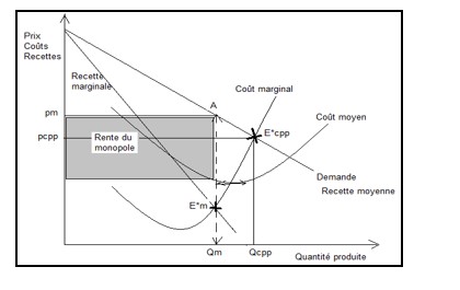 Le point E*cpp est le point d’équilibre du marché lié à une situation de concurrence pure et parfaite. Le producteur produit la quantité qui égalise la recette marginale et le coût marginal : c’est le point E*. La recette marginale, celle de dernière unité produite, est donc alors égale (la au coût marginal. La quantité échangée Qcpp se fixe donc, par report, sur la courbe de demande.