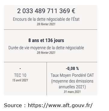 L'Agence France Trésor (AFT), qui a la charge du placement de la dette de la France sur les marchés financiers, a pu financer ses obligations à moyen et long terme à taux négatif en 2020. Le taux de l’obligation assimilable du Trésor (OAT) à 10 ans est tombé sous le seuil de 0%. Le gouvernement français se fait donc payer pour émettre de la dette sur les marchés financiers !