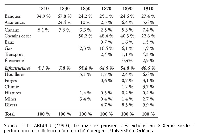 Premièrement, les secteurs qui font appel à l’épargne public pour se développer apparaissent très divers (banques, transports maritimes, filatures, mines, etc.). Toutefois, les sociétés spécialisées dans les infrastructures (canaux, chemin de fer, transport) dominent le marché boursier à partir du milieu des années 1830. Cette place s’explique surtout par l’importance des actions des compagnies de chemins de fer qui vont représenter la moitié de la capitalisation boursière de Paris au milieu du XIXème siècle (48,4% en 1870).