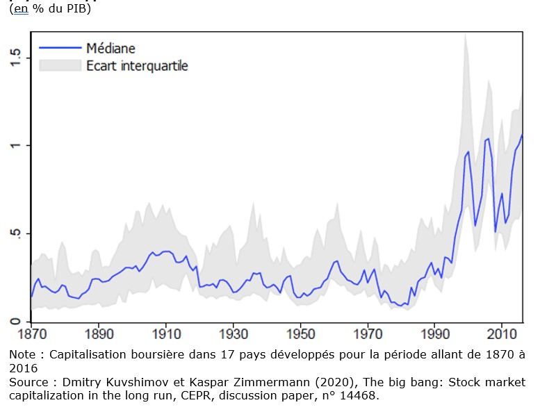 D. Kuvshimov et K. Zimmermann (2020) ont étudié la capitalisation boursière dans 17 pays développés pour la période allant de 1870 à 2016. Il utilise l’expression de « big bang » pour souligner que le ratio entre les cours boursiers sur le PIB, qui stagnait autour de 0,3 sur le siècle qui précéda les années quatre-vingt, a triplé au cours des années quatre-vingt et quatre-vingt-dix. Ce « big bang », (Kuvshinov et Zimmermann) s’est ensuite traduit par un ratio cours boursiers sur le PIB élevé.