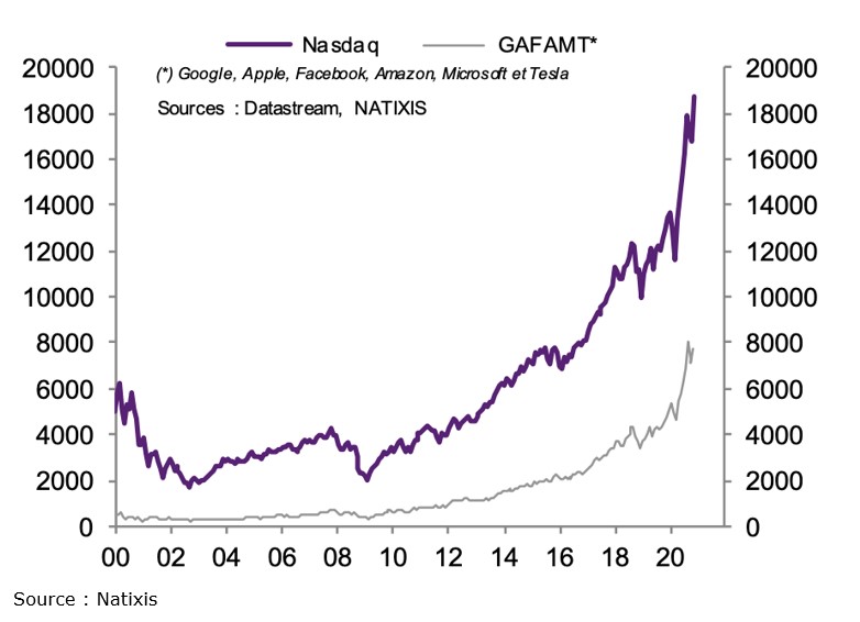 La crise des subprimes (2007-2008) apparaît comme un nouvel accident transitoire dans un mouvement de valorisation rapide des sociétés technologiques. En 2020, la capitalisation des sociétés cotées au Nasdaq s’élève à plus de 1900 milliards de dollars et celle des principaux conglomérats du numérique, les GAFAMT, à près de 800 milliards de dollars. L’activité boursière a donc été tirée par les performances des sociétés de technologies (NTIC, biotechnologies, etc.).